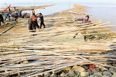 一旁,駕駛著機船的漁民們,或忙著收網(wǎng),或配合將割下的竹子運回岸邊。船只在湖面上留下道道漣漪,灘涂上抗著竹子的漁民蜿蜒成一幅畫。
