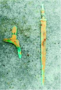 現場施工負責人杜正祥介紹,這里的村民文物保護意識強,這個安置點是7月28日開始施工,用挖掘機挖基腳,第二天,民工們用鏟清理基腳泥土時,挖出一硬物,刨出來一看,是一把生了銅銹的劍,還有一把彎彎的刀,大家認為這可能是文物。