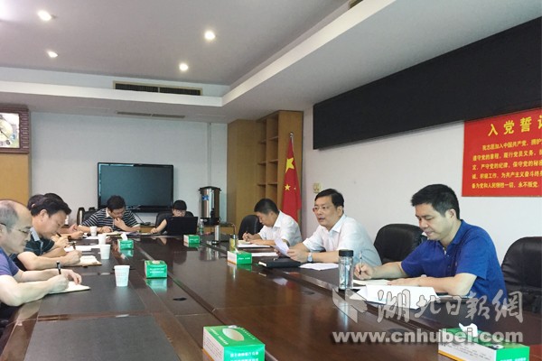 咸寧市委書記丁小強(右二)、咸寧市紀委書記程良勝(右一)、咸寧市委秘書長、市主體辦主任張方勝(右三)集體約談該市3家2016年黨風廉政建設(shè)不合格單位黨委書記。記者 江萌 攝