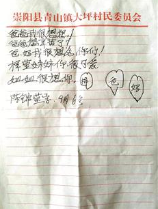在箱底,童鵬飛發(fā)現(xiàn)了一封信,字不多也不算工整,但明顯可以看出寫得很認真。信紙上畫了三顆心,里面分別寫著“梓”“爸”“媽”字樣,落款為“陳錦瑩字,9月6號”?!斑@應(yīng)該是叫陳錦瑩的小朋友寫給爸爸媽媽的信,信不見了的話,孩子應(yīng)該會很傷心的?!笨吹叫偶埵恰扒嗌芥?zhèn)大坪村村委會”的,童鵬飛立即聯(lián)系了青山派出所,請求協(xié)助尋找陳錦瑩小朋友。遺憾的是,查無此人。