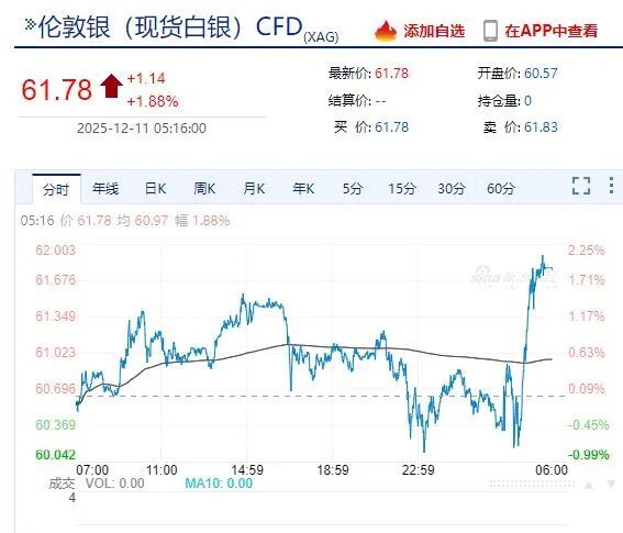 現(xiàn)貨白銀日內(nèi)漲幅近2%,報(bào)61.78美元/盎司,再創(chuàng)歷史新高。